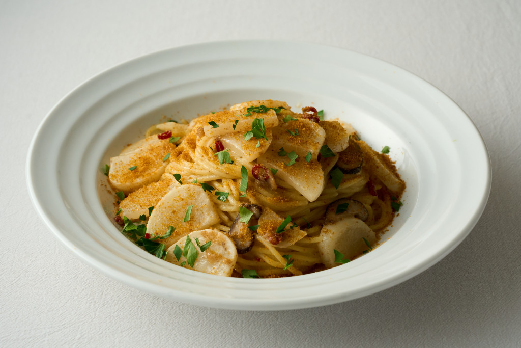甘みの増した冬の蕪を贅沢に使用したオイルパスタ。椎茸の豊かな風味、からすみの濃厚なコクがパスタ全体を格上げします。香り豊かな生のレモンを搾り軽やかさを加えることで、上質で洗練された味わいに仕上げました。