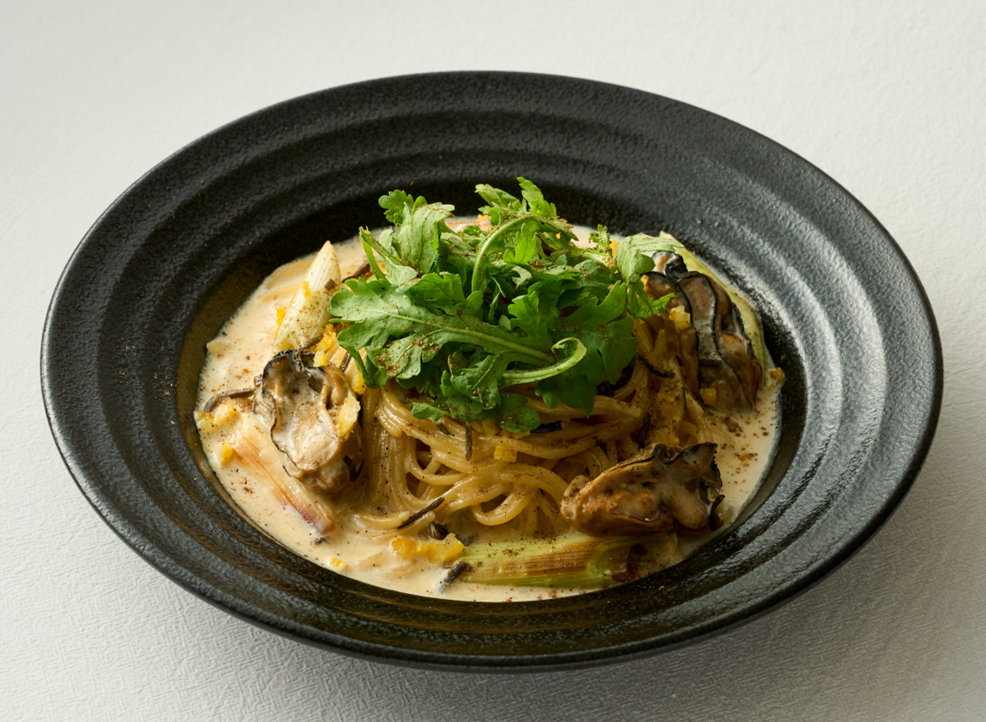 三陸産の濃厚な牡蠣と生クリームソースが絡む、冬の贅沢なクリームパスタ。長ネギを香ばしく焼き上げ、仕上げに柚子と山椒の香りをまとわせました。ほろ苦いサラダ春菊がアクセントになり、和の香りが引き立つ特別な一皿です。