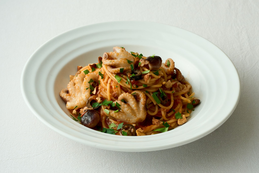 冬に旬を迎えるイイダコをメインにした旨味凝縮のプッタネスカ。アンチョビ、ケッパー、ブラックオリーブの濃厚な旨味をトマトソースに閉じ込めました。イイダコの絶妙な食感と、砕いたアーモンドの香ばしさが口の中でハーモニーを奏でます。